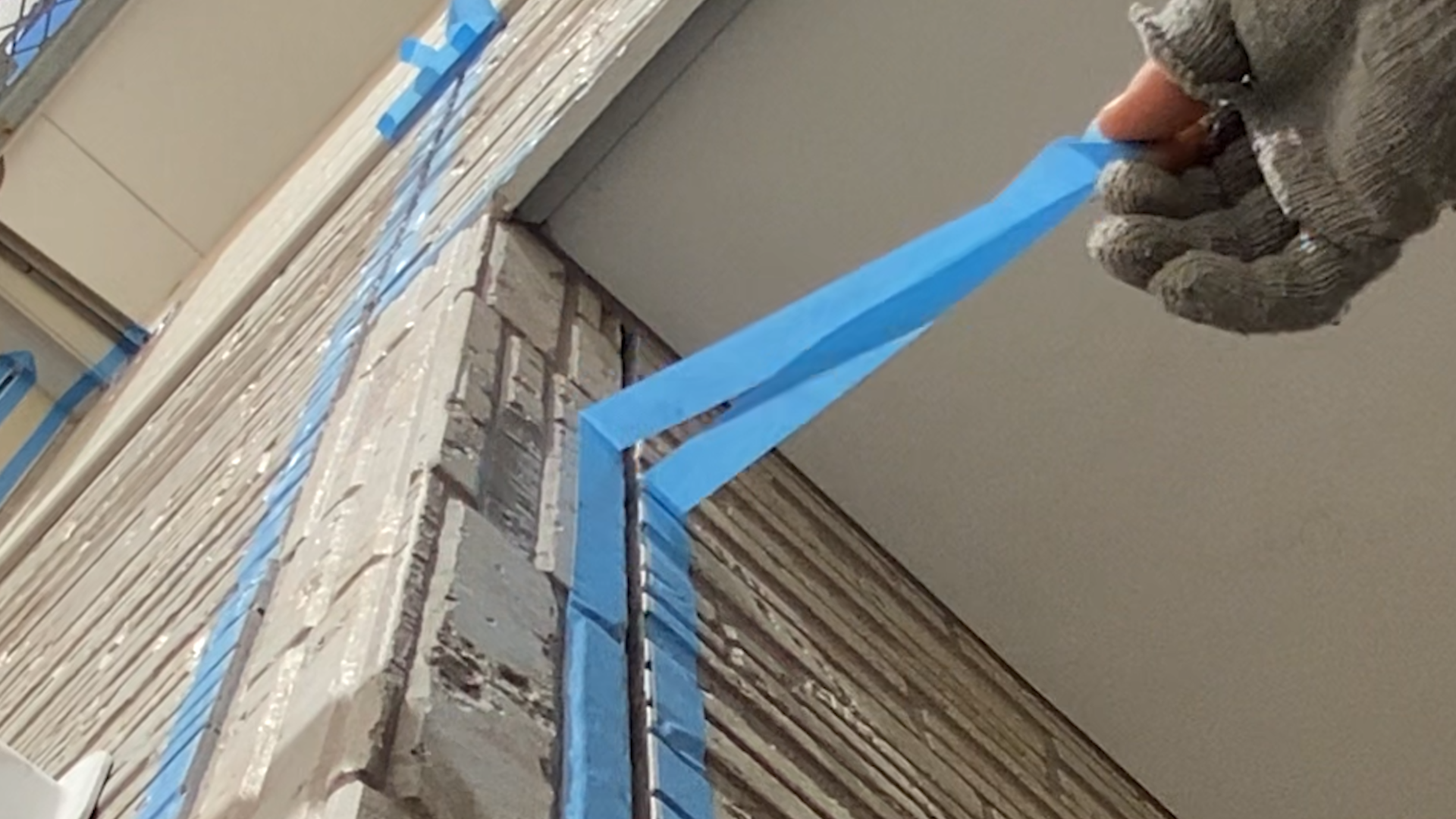 縦目地を養生する際に、養生に慣れている方であればグルリと一周養生をしてしまいますが、慣れてないとテープを折って曲げるときにうまくいかなかったり、テープがぐちゃぐちゃになったりすることもあります。キレイに一周するとなればかなりの経験(時間)を積まなくてはいけませんが、効率的に考えるのであれば1度テープを切って水切りの部分だけ養生する方が良いです。コツとして水切りを汚さないことが一番大切なのです。 - 2、養生テープと目地の適正な間隔