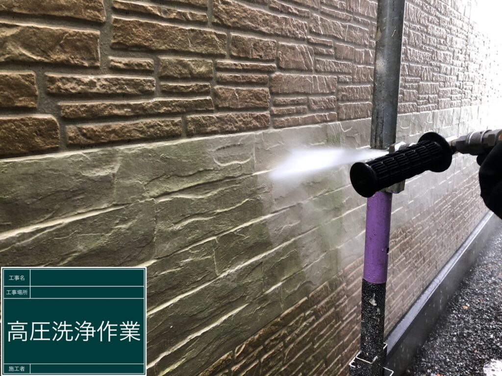 全体的に付着しているコケや汚れを高圧洗浄機で落とし、塗装との密着を良くしていきます。