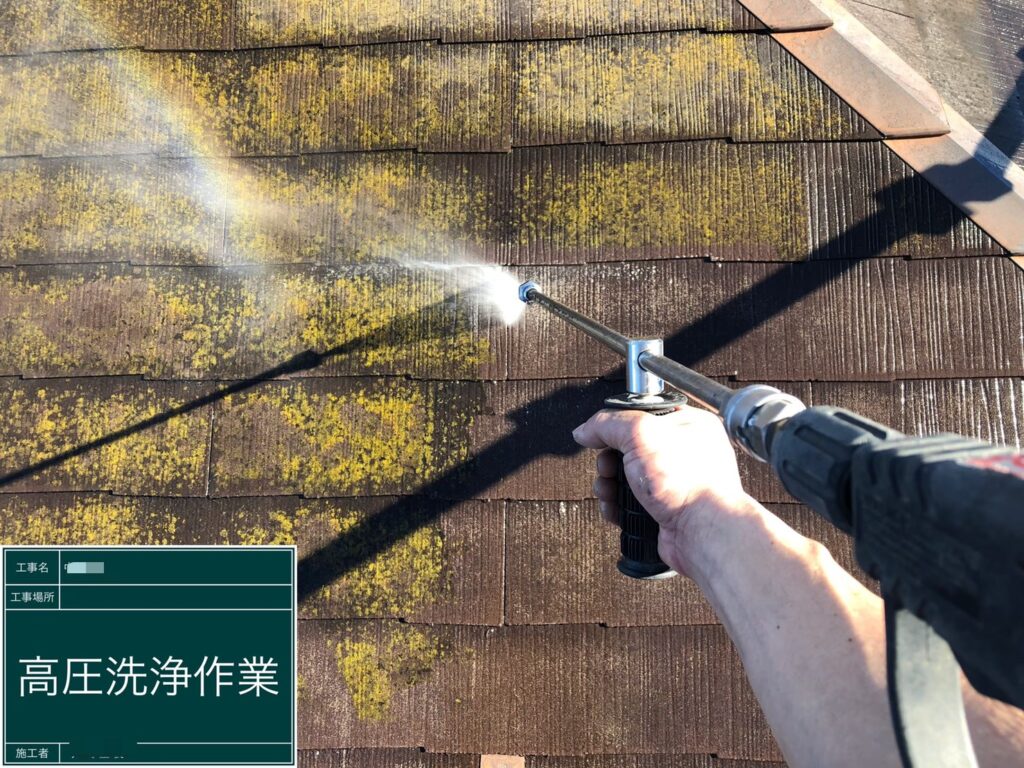 コケが出ていることから、スレートに多くの水分が含まれていることが分かります。つまり、スレートが傷んでいるということです。洗浄でコケをキレイに落とし、塗装をしていきます。