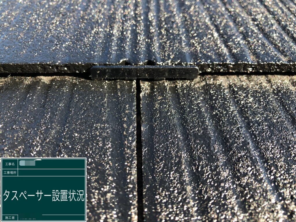 八王子市N様邸の屋根塗装では、スレートとスレートの重なり目が塗膜でくっ付いてしまうので、タスペーサーと呼ばれる部材を使い、重なり目に隙間を作ります。この隙間があることによって、スレートの裏にある湿気などを追い出し、雨が降った時の雨水を適切に排水することができます。
