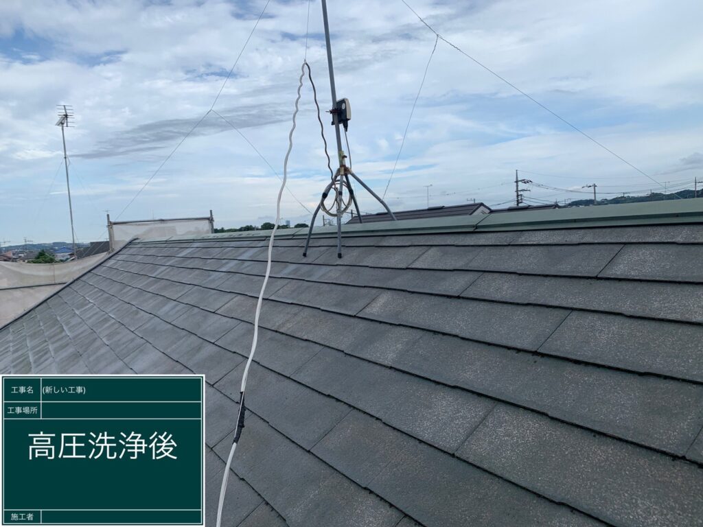 こちらが八王子市F様邸の屋根の洗浄後になります。コケもしっかりと洗い流すことができ、洗浄前と比較するとかなりのコケが付着していたことがわかります。屋根塗装をする上で、コケが付着していると塗料の密着がうまくできず、塗膜が剥がれてしまうので、塗装をする上で洗浄作業は非常に重要な作業となります。