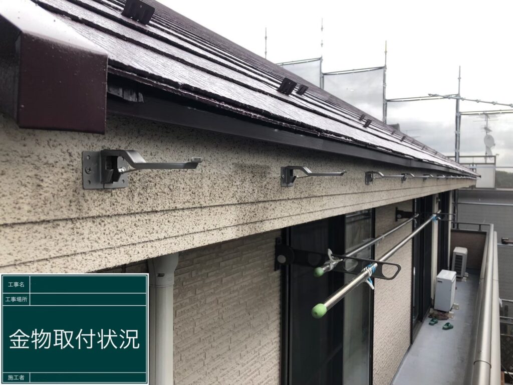 金具の取り付けの際は、既存の金具の位置から少しずらしています。そして、既存の金具があった穴は雨水が入らない様、コーキングで防水処理をし、塗装しております。