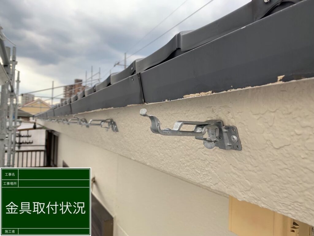 金具の取り付けの際は、既存の金具の位置から少しずらしています。そして、既存の金具があった穴は雨水が入らない様、コーキングで防水処理をし、塗装しております。