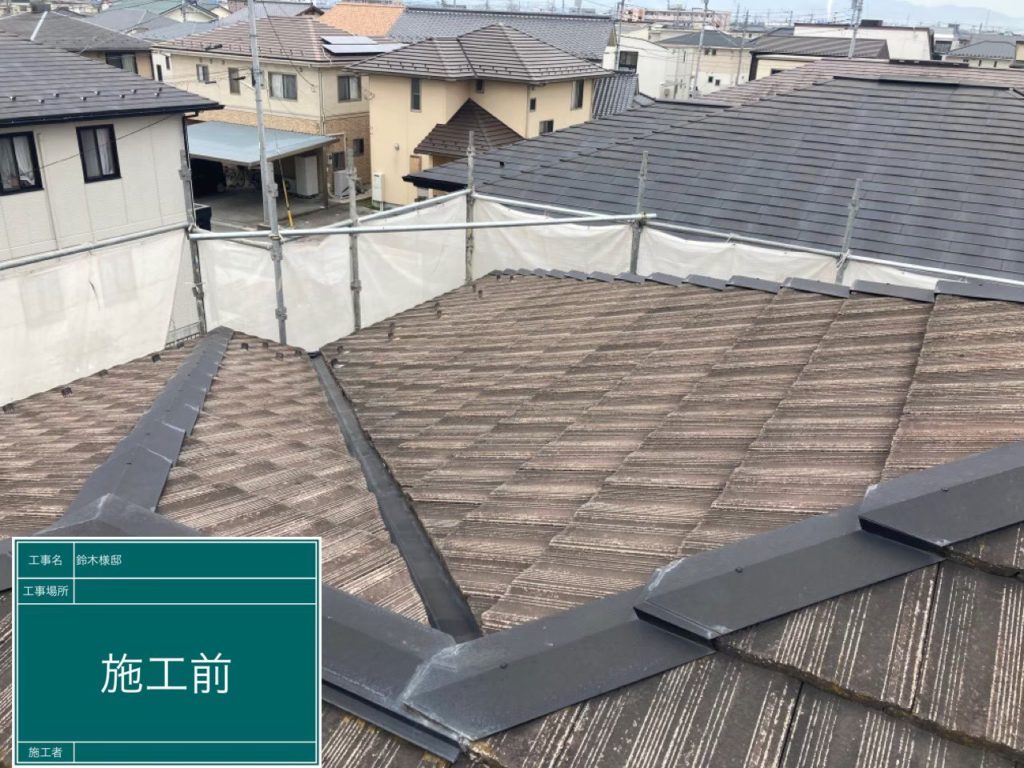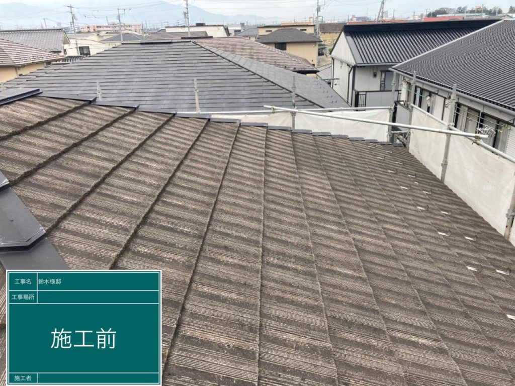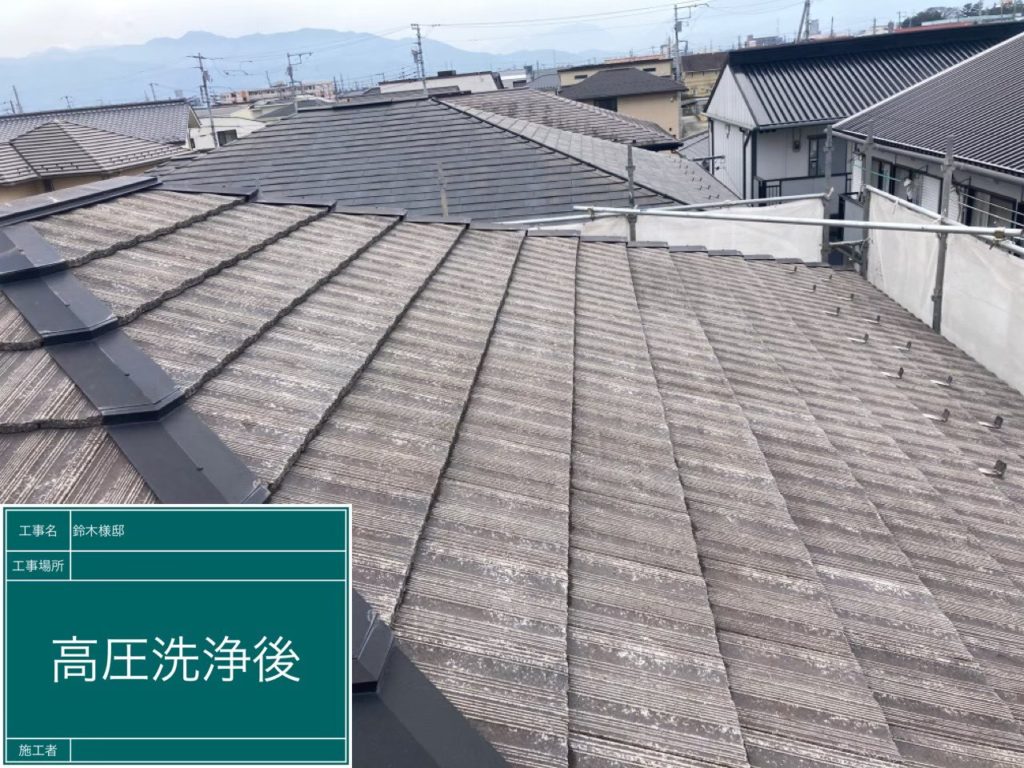 全体的に屋根の汚れ(コケ等)が目立ってしまっているので、高圧洗浄で汚れを落としてから塗装していきます。